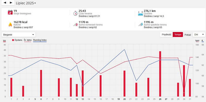 W lipcu wyszło około 276 km. Kolejny miesiąc gdzie trzymamy się w kilometrażu powyżej 200 km.