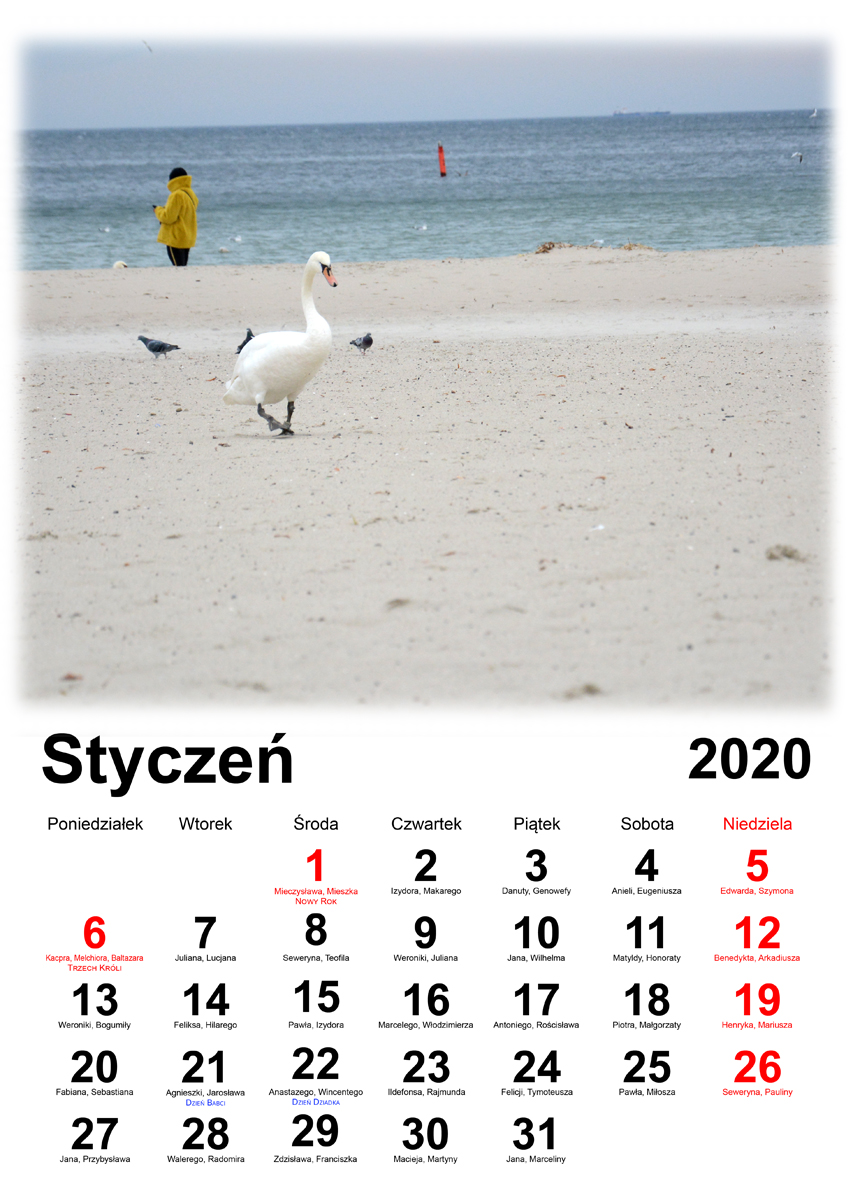 Styczeń – tak więc motyw łabędzia nad morzem.